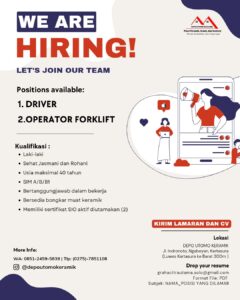 - Berkas Lamaran, CV, dan berkas pendukung lainnya dapat dikumpulkan melalui menu “Lamar Sekarang” dibawah, atau datang langsung ke : Depo Utomo Keramik di Jl. Indronoto, Ngabeyan, Kartasura.